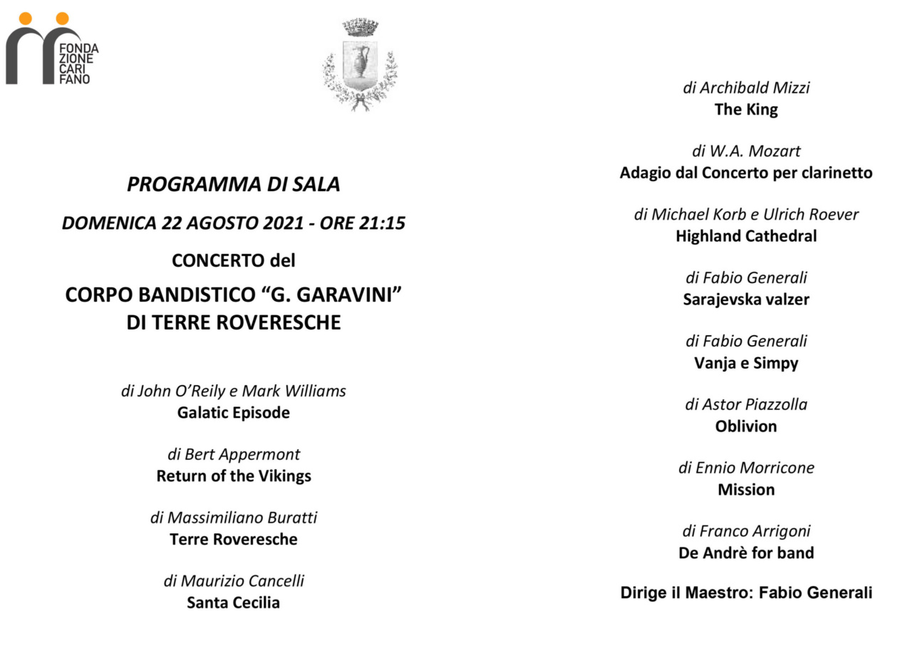 Domenica 22 agosto, alle ore 21,15 alle Corte del Nespolo di Palazzo Bracci Pagani è in programma il concerto del Corpo Bandistico “G. Garavini” di Terre Roveresche. Dirige il Maestro Fabio generali.