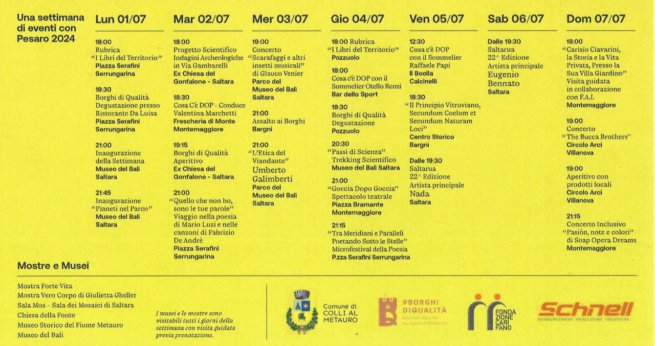 Dall’1 al 7 luglio è il Comune di Colli al Metauro il nuovo protagonista di ‘50×50Capitali al quadrato’, il progetto simbolo di Pesaro 2024 che vede i cinquanta Comuni della Provincia di Pesaro e Urbino, a turno, Capitale per una settimana lungo il 2024. In perfetta sintonia con i valori di Pesaro 2024, il programma va alla scoperta dei ‘Borghi della Qualità’ per un’esperienza unica tra paesaggi di storia, sapori e tradizioni. Il territorio di Colli al Metauro è intriso di storia, arte, cultura ed eccellenze enogastronomiche, in un paesaggio collinare che si estende dalla costa all’Appennino. Piazze e vicoli dei centri storici saranno animati da conferenze, concerti, laboratori di poesia e ceramica, con l’obiettivo di esplorare i legami tra arte, natura e tecnologia, elementi fondamentali di un nuovo concetto di cultura diffusa, inclusiva, partecipata e sostenibile, sempre in un costante dialogo con l’ambiente circostante.