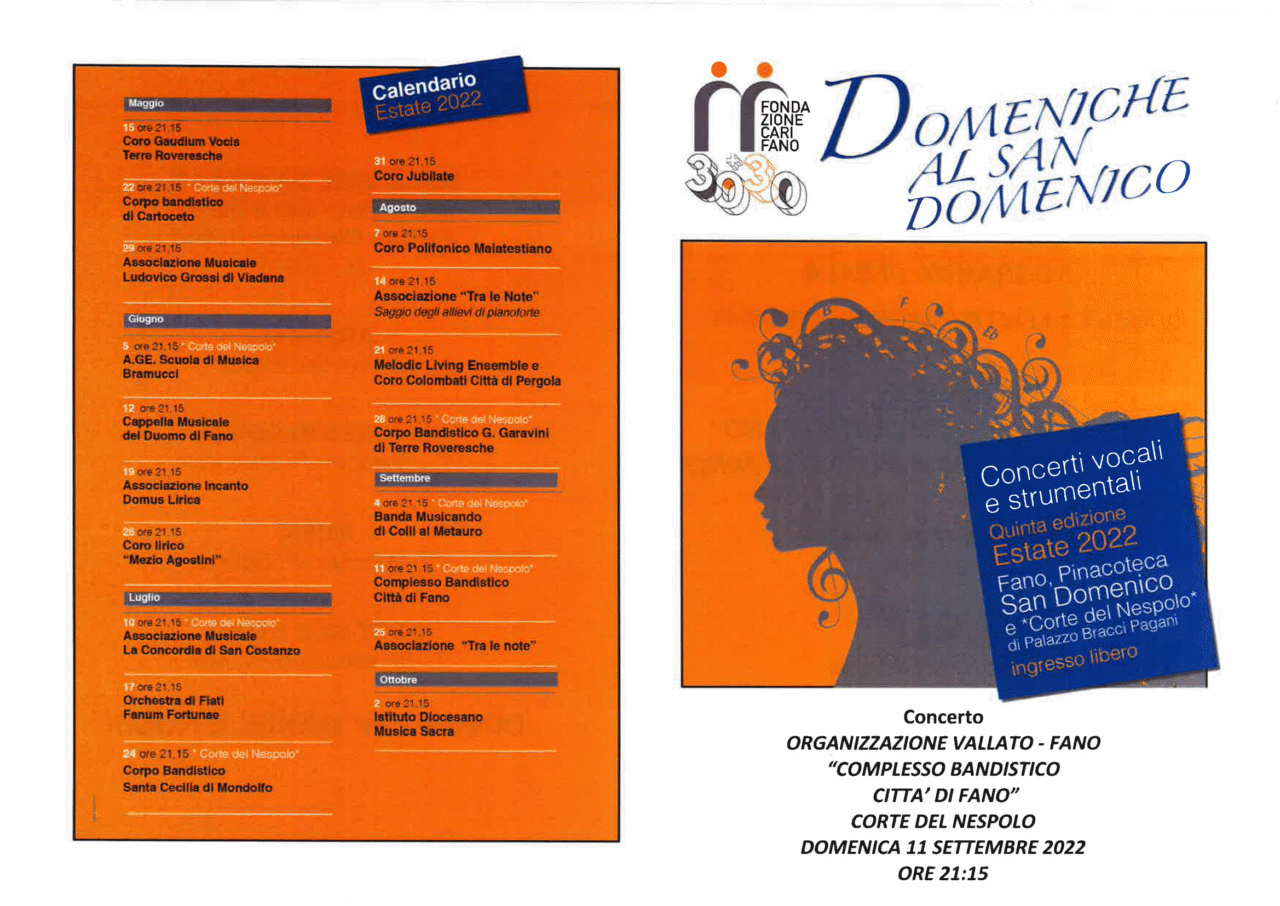 Concerto “Complesso bandistico città di Fano” realizzato dall’organizzazione Vallato Fano, che si terrà domenica 11 settembre 2022 alle ore 21:15 presso la Corte del Nespolo di Fano