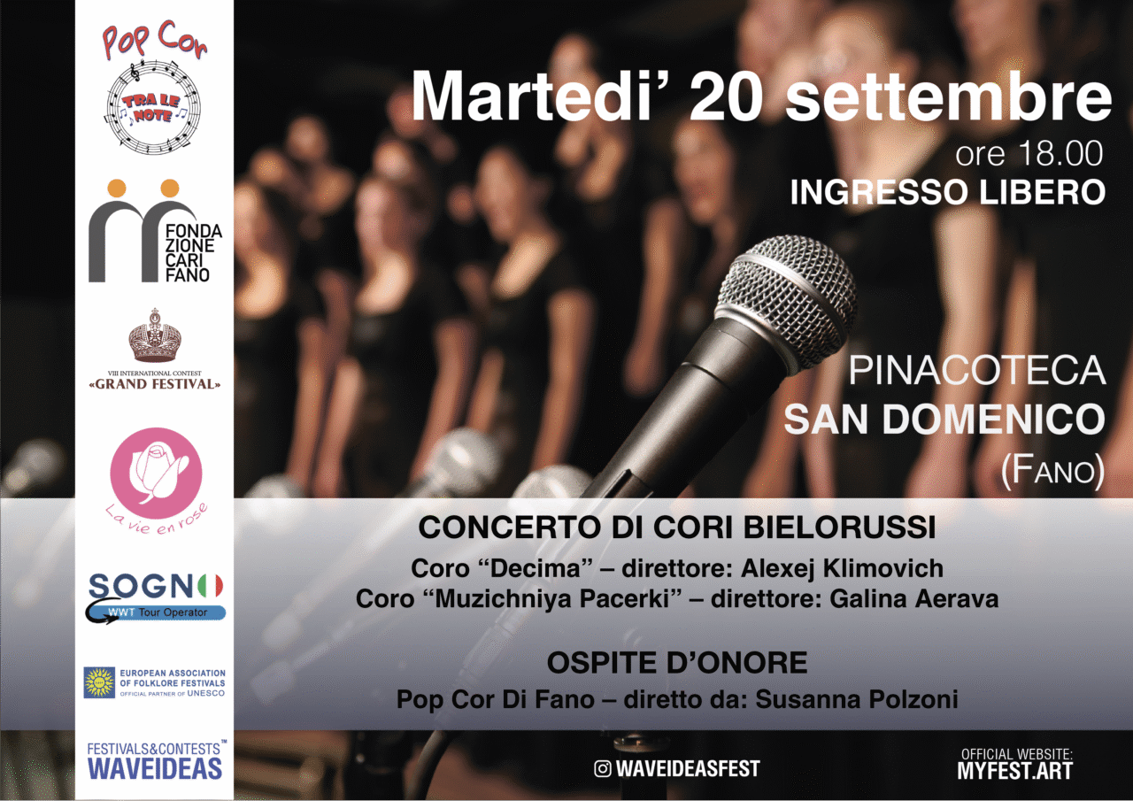 Si esibirà il coro “Decima” diretto da Alexej Klimovich e a seguire il coro “Muzichniya Pacerki” diretto da Galina Aerava. Avremo l’onore di ospitare il coro “Pop Cor” diretto da Susanna Polzoni