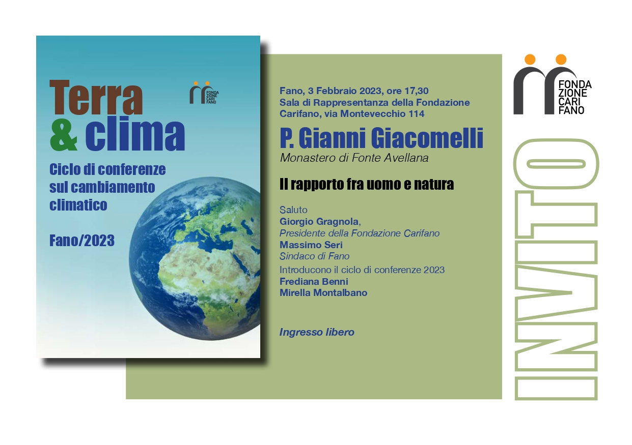 “Il rapporto fra uomo e natura” è questo il titolo del nuovo incontro del ciclo di conferenze dal titolo ” Terra e clima” che si terrà nella Sala di Rappresentanza della Fondazione Carifano venerdì 3 febbraio e che vedrà tra i relatori Padre Gianni Giacomelli.