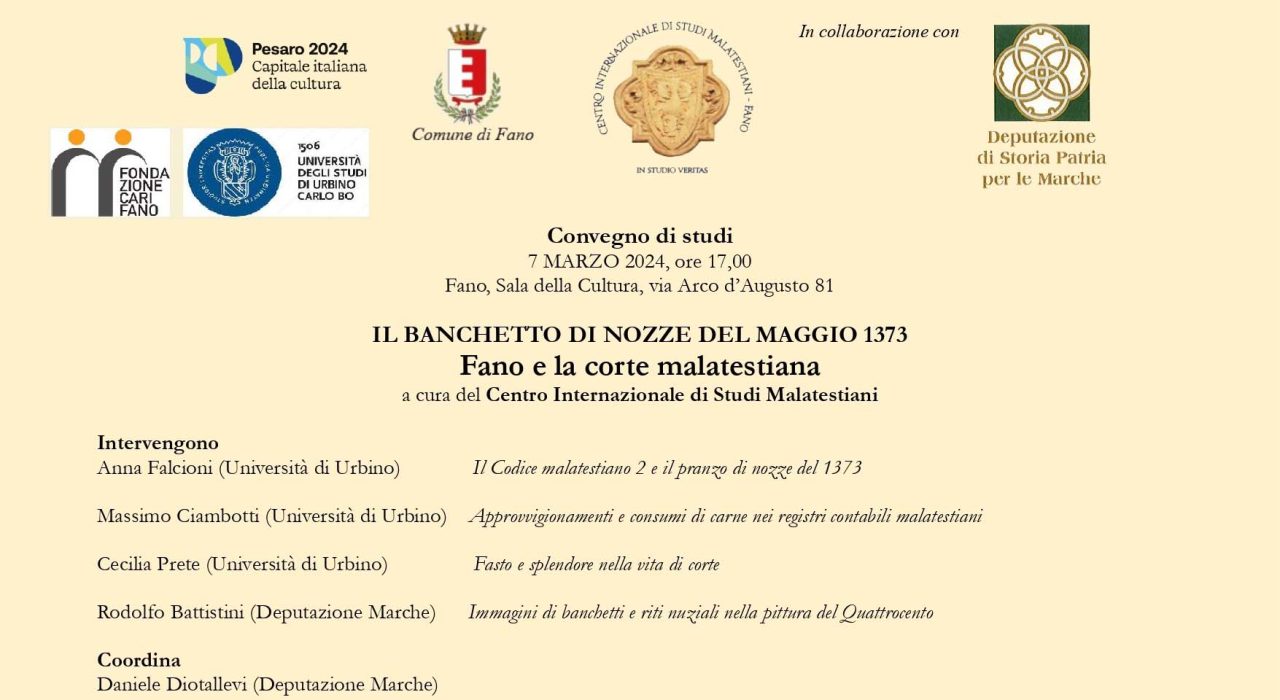 Il Centro Internazionale di Studi Malatestiani organizza per giovedì 7 marzo alle ore 17,00 presso la Sala della Cultura in via Arco d’Augusto, 81 a Fano un convegno di studi dal titolo Il banchetto di nozze del maggio 1373. Fano e la corte malatestiana con la partecipazione di Anna Falcioni, Massimo Ciambotti, Cecilia Prete e Rodolfo Battistini. Coordina Daniele Diotallevi.