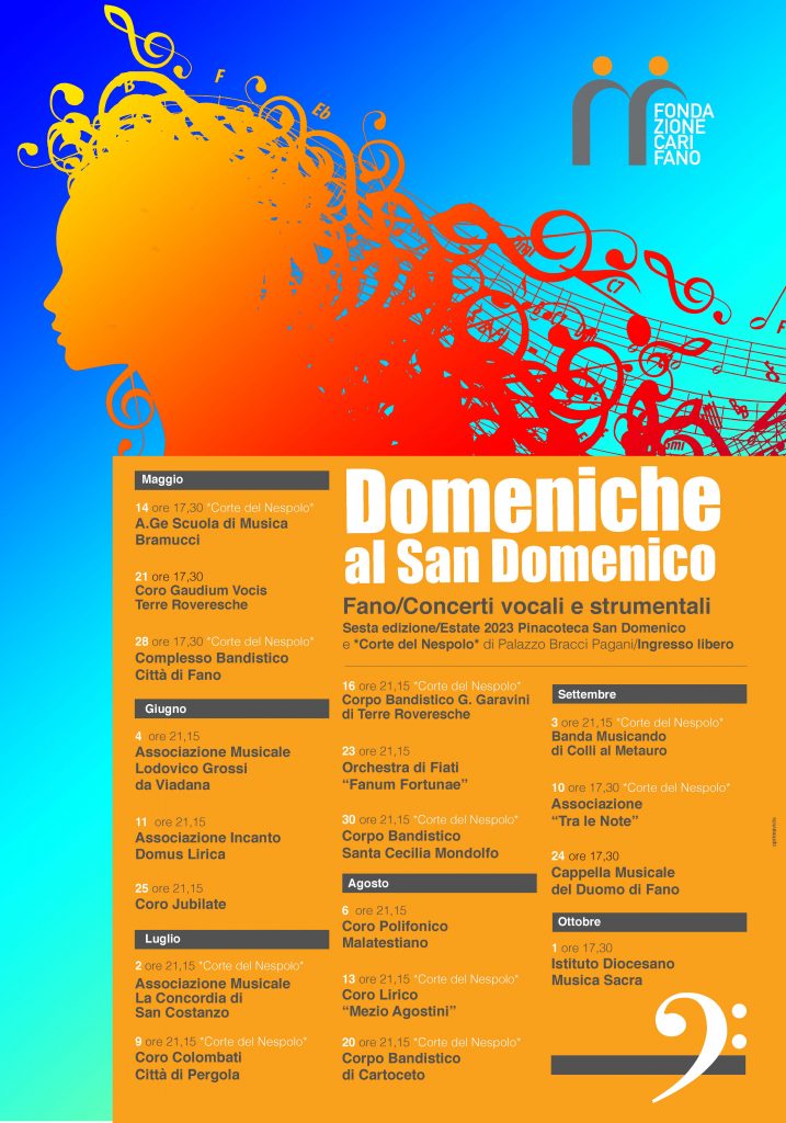 Prende il via la sesta edizione della rassegna “Domeniche al San Domenico”. Organizzate dalla Fondazione Carifano, la serie di concerti corali e strumentali che partiranno il 14 maggio per terminare il 1° ottobre saranno l’occasione per esaltare il talento artistico degli iscritti alle scuole musicali del territorio che avranno l’opportunità di esibirsi nella cornice della suggestiva Pinacoteca “San Domenico” e nella Corte del Nespolo di Palazzo Bracci Pagani.