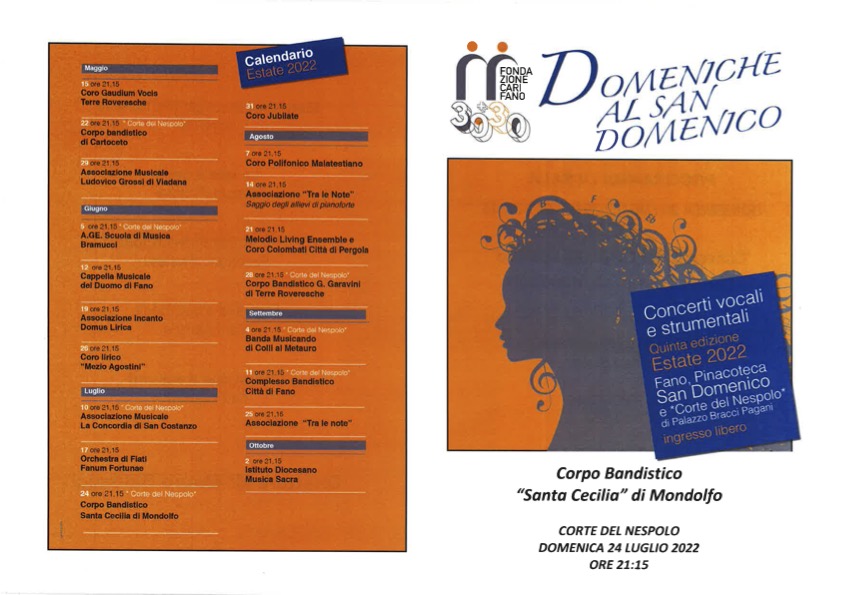 Domenica 24 luglio alle 21:15 è previsto alla Corte del Nespolo di Palazzo Bracci Pagani il concerto della rassegna “Le Domeniche al San Domenico”, con la partecipazione della Banda di Mondolfo Santa Cecilia.
