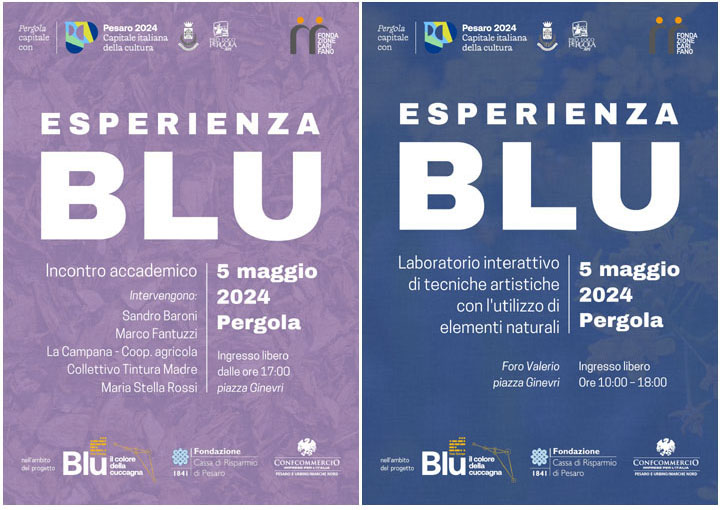 Domenica 5 maggio alle ore 17,00 in Piazza Ginevri si terrà un incontro accademico con interventi di Sandro Baroni, Marco Fantuzzi, La Campana Coop.agricola, Collettivo Tintura Madre, Maria Stella Rossi oltre a laboratori interattivi di tecniche artistiche con l’utilizzo di elementi naturali sempre in Piazza Ginevri dalle ore 10,00 alle ore 18,00. Un diversificato gruppo di Maestri Tintori, provenienti da tutto lo stivale, ciascuno con la propria tecnica, inviterà il pubblico a sperimentare l’antica alchimia dei colori naturali. “Esperienza Blu” a cura di Simona Fronzi in collaborazione con Pro Loco Pergola è realizzato con il contributo della Fondazione Carifano.