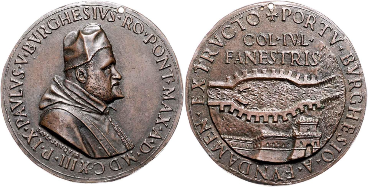 Da un lato la medaglia mostra il busto di Paolo V, mentre dall’altro è raffigurata una veduta a volo d’uccello della darsena Borghese sotto la guardia della fortezza Malatestiana e con la legenda “PORTV BVRGHESIO  A FVNDAMEN  EXTRVCTO”.