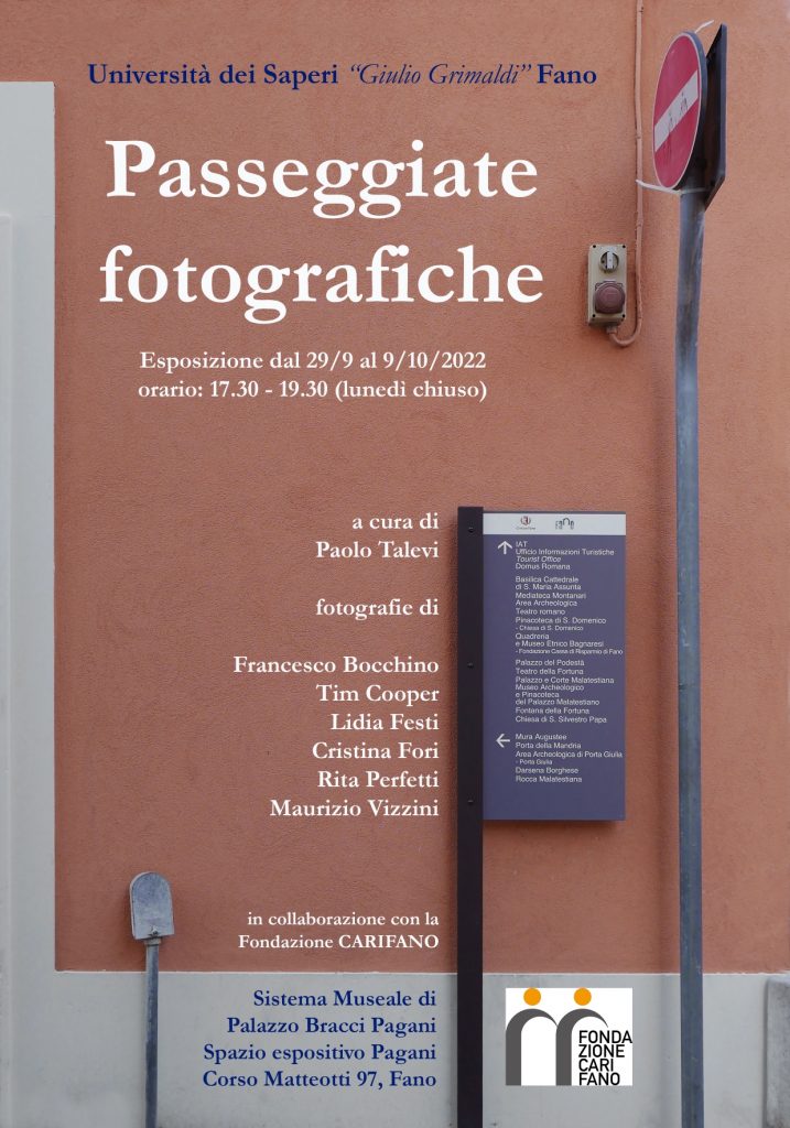 Sarà inaugurata giovedì, 29 settembre, alle ore 17,30 presso lo Spazio Espositivo Pagani di Palazzo Bracci Pagani in Fano la mostra “Passeggiate fotografiche”, a cura di Paolo Talevi e con l’organizzazione dell’Università dei Saperi “G. Grimaldi” di Fano. La manifestazione, inoltre, svelerà gli scatti di alcuni partecipanti al corso annuale di fotografia.