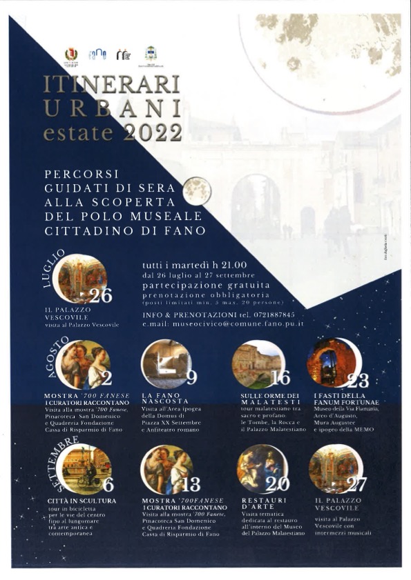 ITINERARI URBANI estate 2022 – percorsi guidati di sera alla scoperta del polo museale cittadino di Fano in collaborazione con il Comune di Fano e la Diocesi di Fano, Fossombrone, Cagli e Pergola.