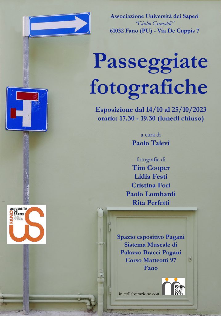Aprirà sabato 14 ottobre alle ore 17,30 presso lo Spazio Espositivo Pagani del Sistema Museale di Palazzo Bracci Pagani a Fano la mostra fotografica collettiva “Passeggiate fotografiche”, a cura di Paolo Talevi e con l’organizzazione dell’Università dei Saperi “G. Grimaldi” di Fano. La manifestazione, svelerà gli scatti di alcuni partecipanti al corso annuale di fotografia organizzato dall’Università dei Saperi che quest’anno verteva sul tema  “Esprimere in fotografia i nostri sentimenti raccontando qualcosa di noi stessi”. Esposizione della mostra dal 14 Ottobre al 25 Ottobre 2023. Orari mostra: 17:30 – 19:30 (lunedì chiuso)