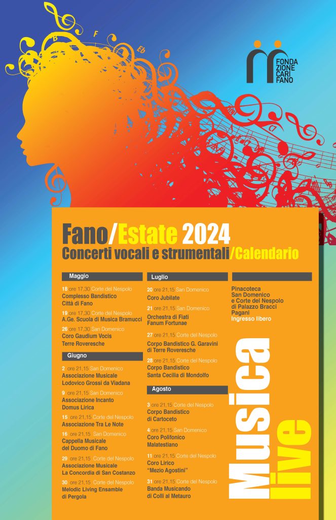 Prende il via sabato 18 maggio il programma di concerti MUSICA LIVE (naturale prosecuzione delle “Domeniche al San Domenico”) organizzati in collaborazione con le scuole di musica presenti sul territorio. I concerti si terranno il sabato e la domenica presso la Pinacoteca San Domenico e la Corte del Nespolo di Palazzo Bracci Pagani.