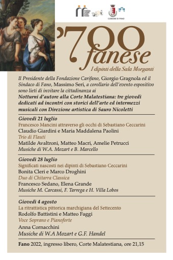 Giovedì 4 agosto alle 21,15 presso la Corte Malatestiana è prevista la terza e ultima serata del ciclo d’incontri Notturni d’autore, incontri con storici dell’arte e intermezzi musicali a corollario dell’evento espositivo ‘700 fanese. I dipinti della Sala Morganti.