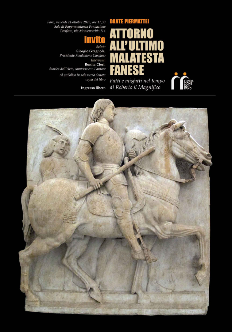 Dopo il saluto del presidente Giorgio Gragnola, l’autore dialogherà con Bonita Cleri, storica dell’arte, per approfondire la figura di Roberto Malatesta, condottiero fanese del Quattrocento, ultimo esponente locale della celebre dinastia che segnò la storia tra Medioevo e Rinascimento.