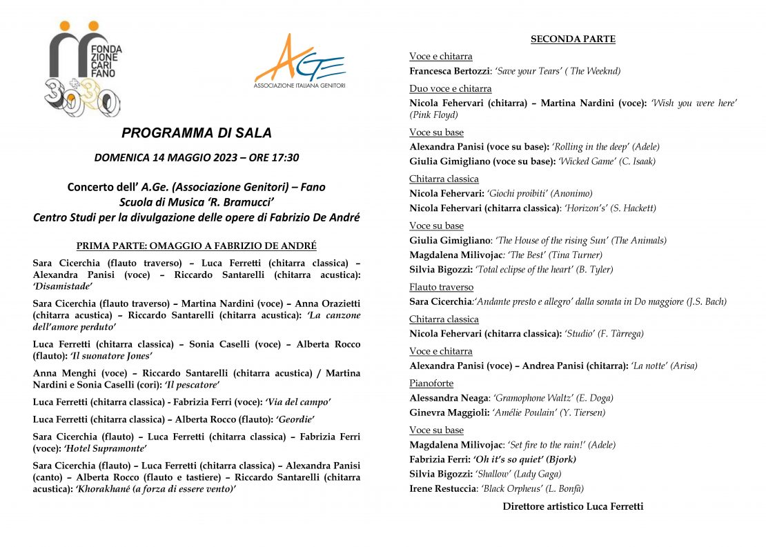 Programma di sala concerto A.Ge. Fano – Scuola di Musica “R.Bramucci” del 14 maggio 2023