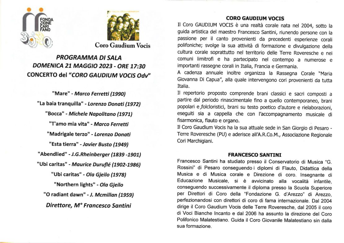 Programma di sala concerto CORO GAUDIUM VOCIS Odv di Terre Roveresche del 21 maggio 2023
