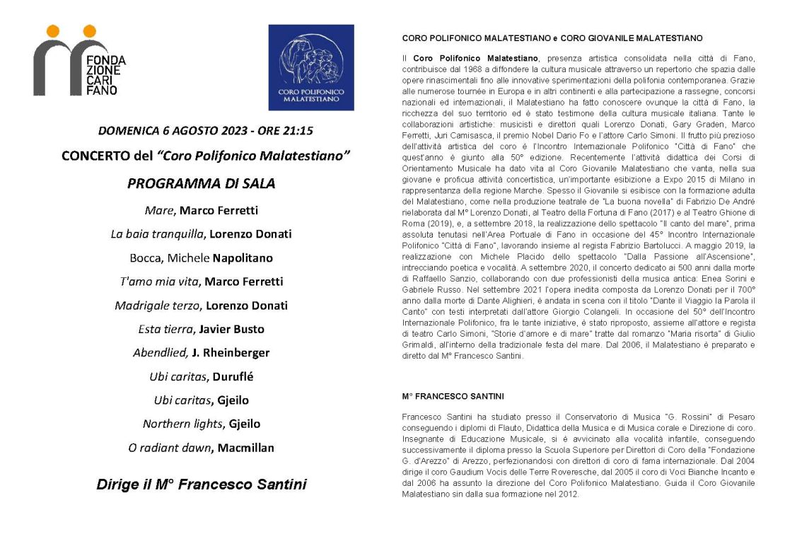 Programma di sala concerto del Coro Polifonico Malatestiano di Fano del 6 agosto 2023