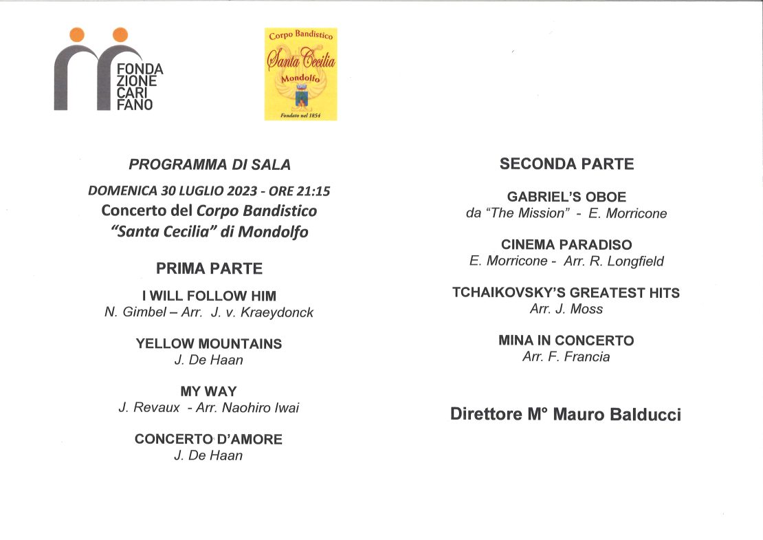 Programma di sala concerto del Corpo Bandistico “Santa Cecilia” di Mondolfo del 30 luglio 2023
