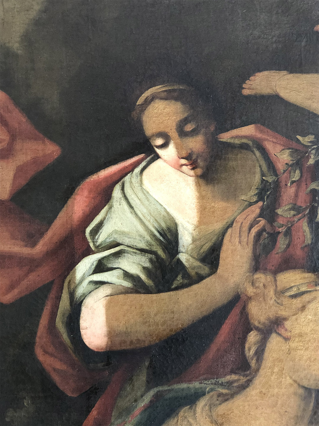 Ignoto sec. XVIII, “Ratto di Europa”, particolare di un saggio di pulitura durante l’intervento di recupero