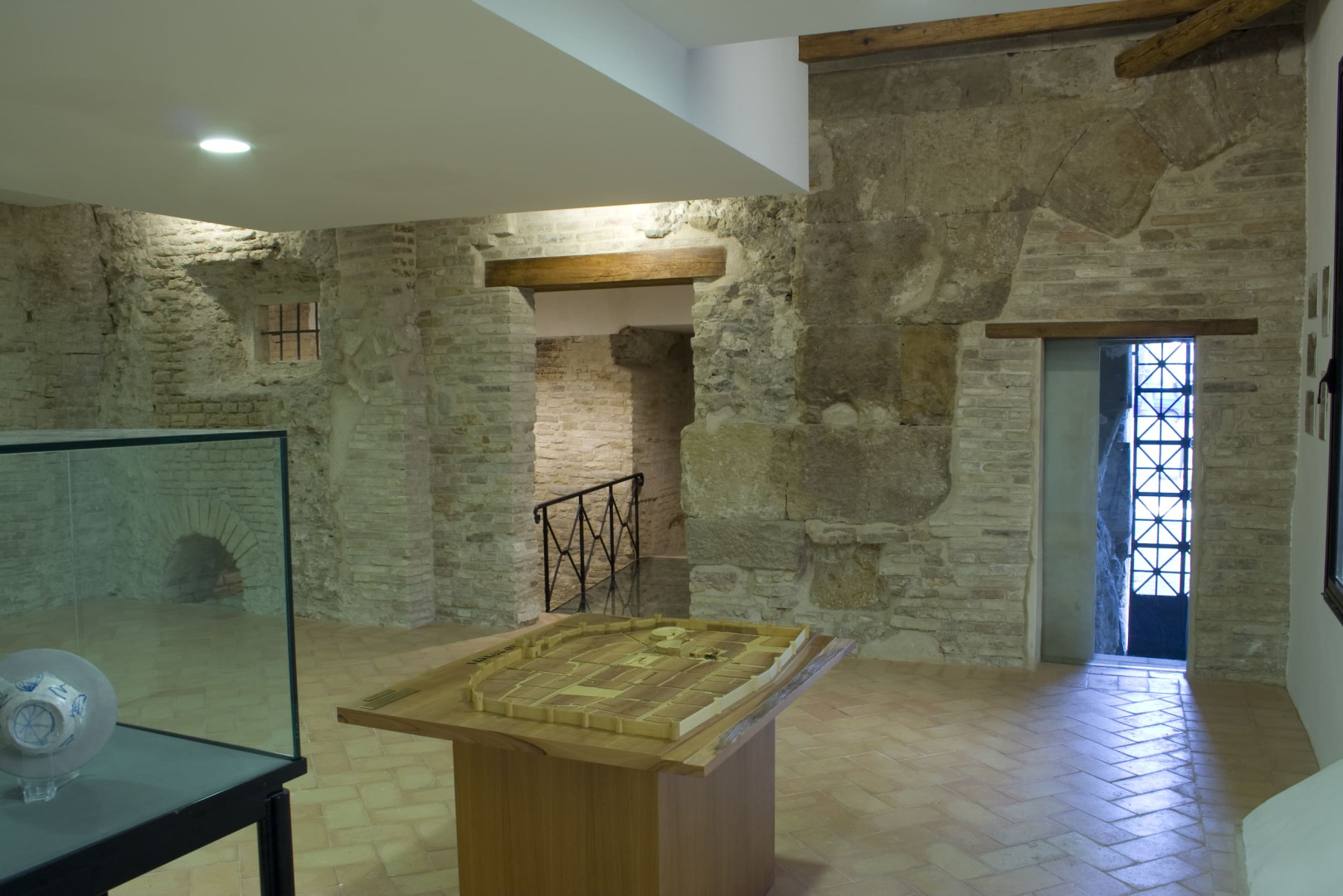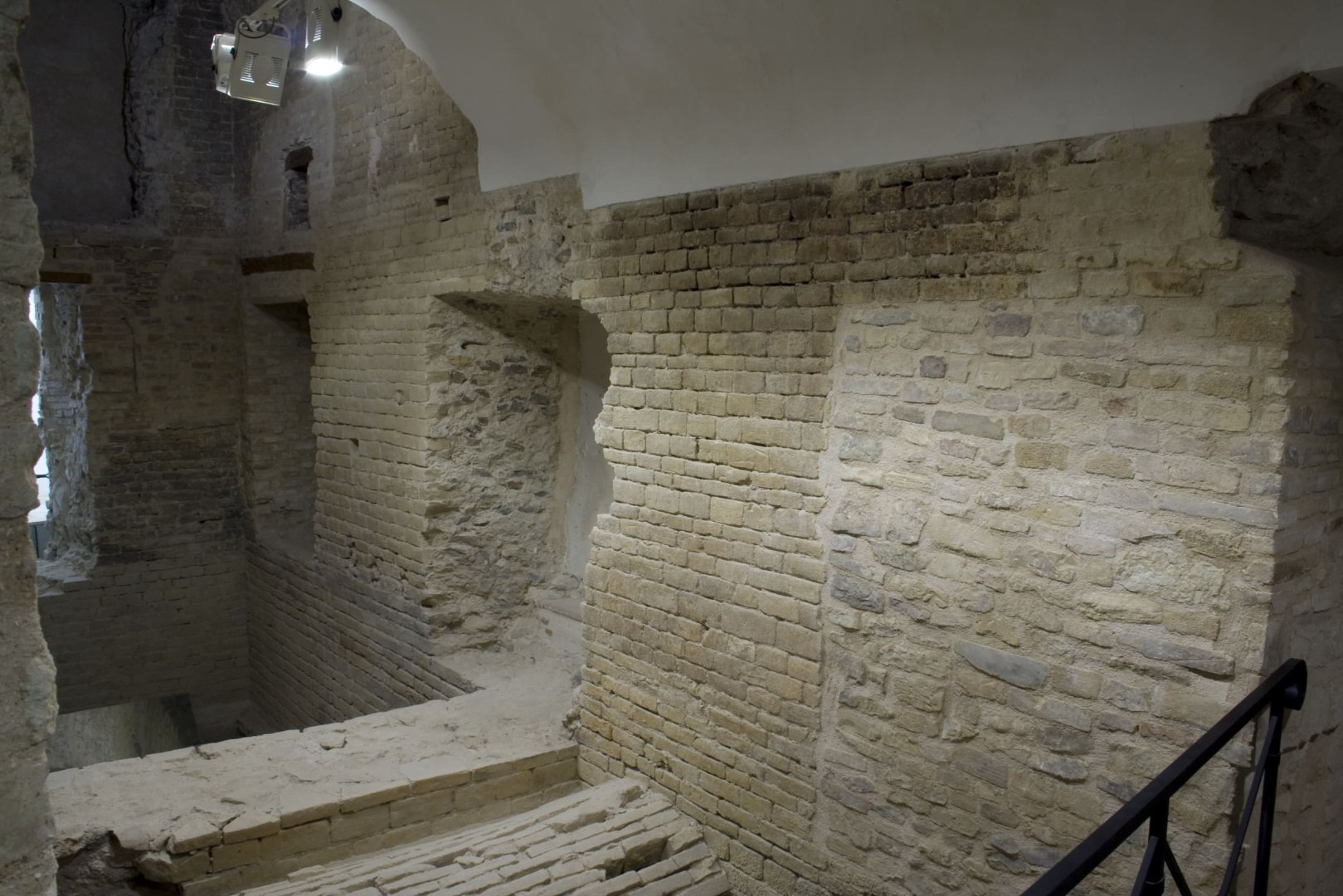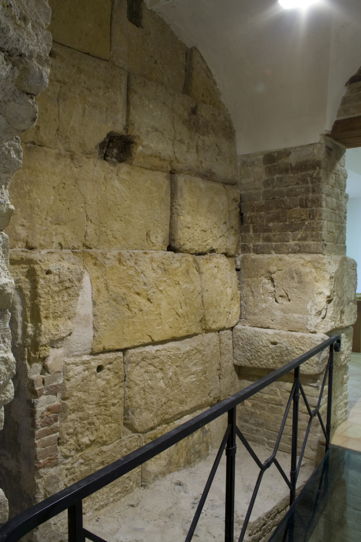 Il Complesso San Michele custodisce al suo interno testimonianze preziose della storia di Fano, inglobando tratti di muratura di epoca romana collegati all’antico Arco d’Augusto. Questi elementi storici sono visibili nell’ambiente interrato, caratterizzato da volte in muratura realizzate in epoche successive, e lungo la rampa che collega il piano terra, fino alle pareti del loggiato affacciato su via Arco d’Augusto, in continuità con la porta romana.