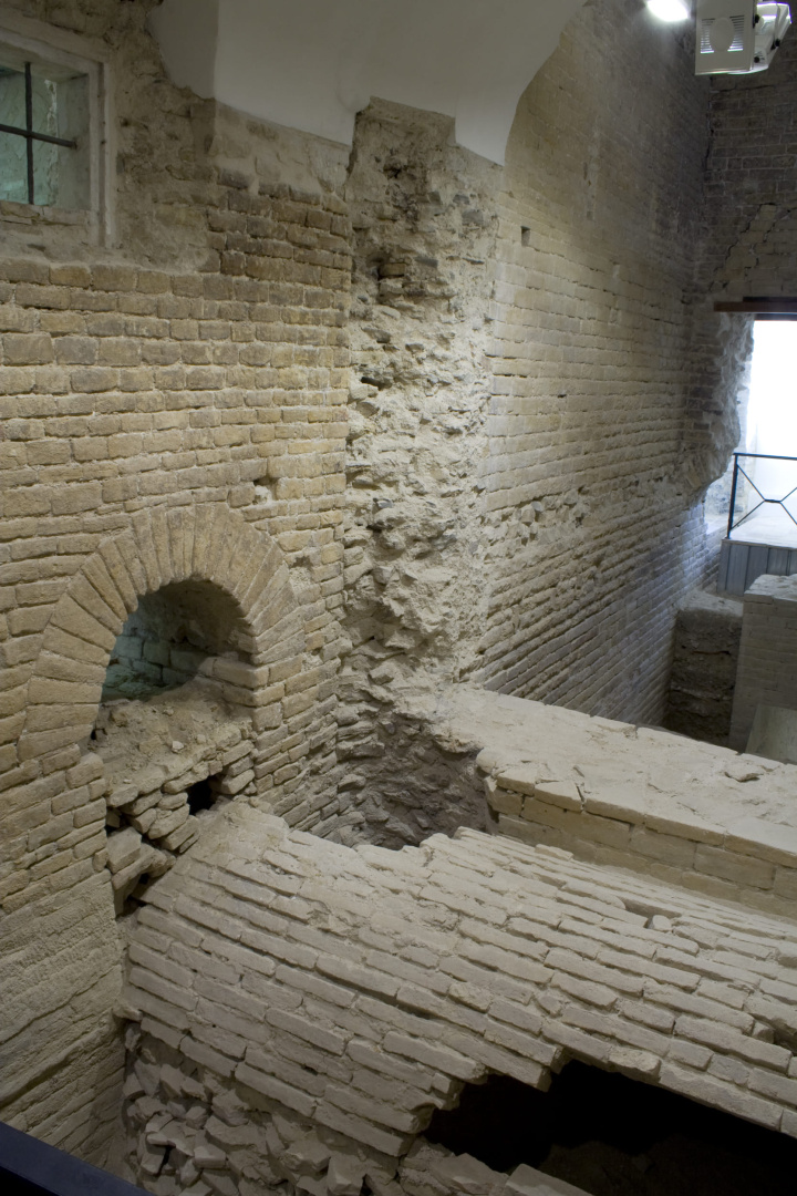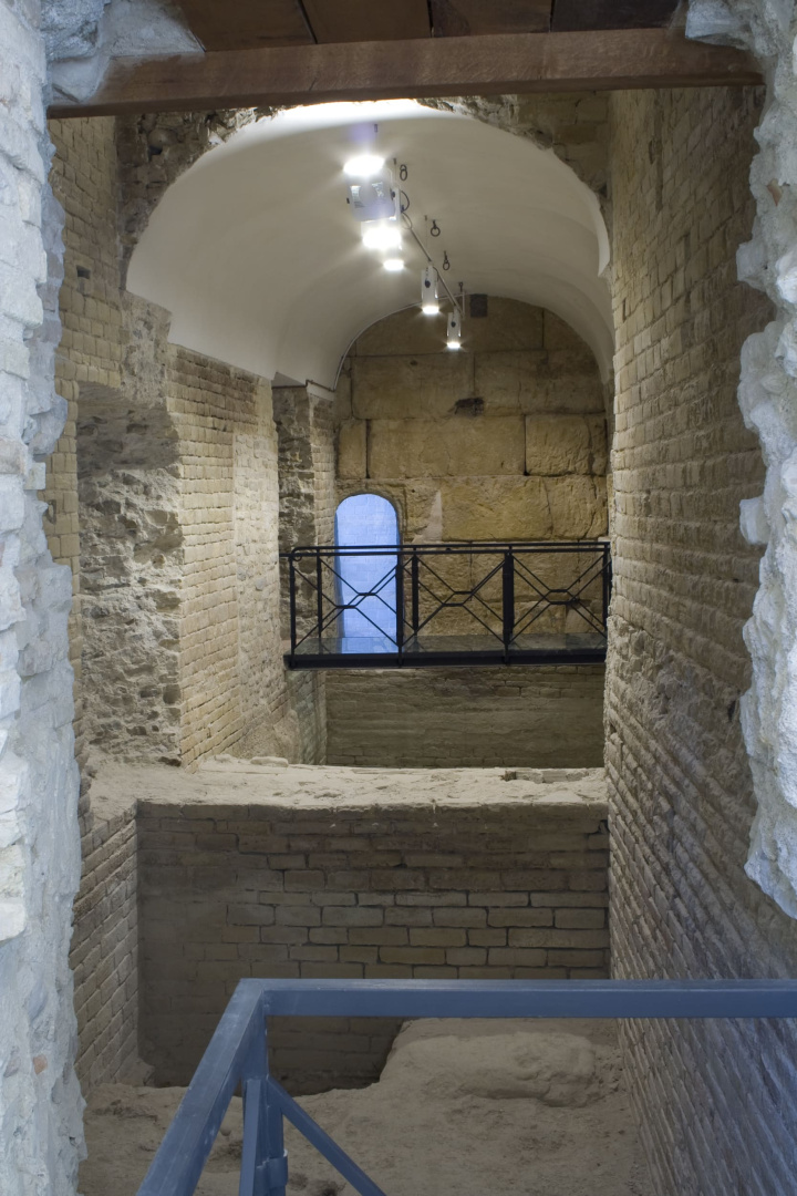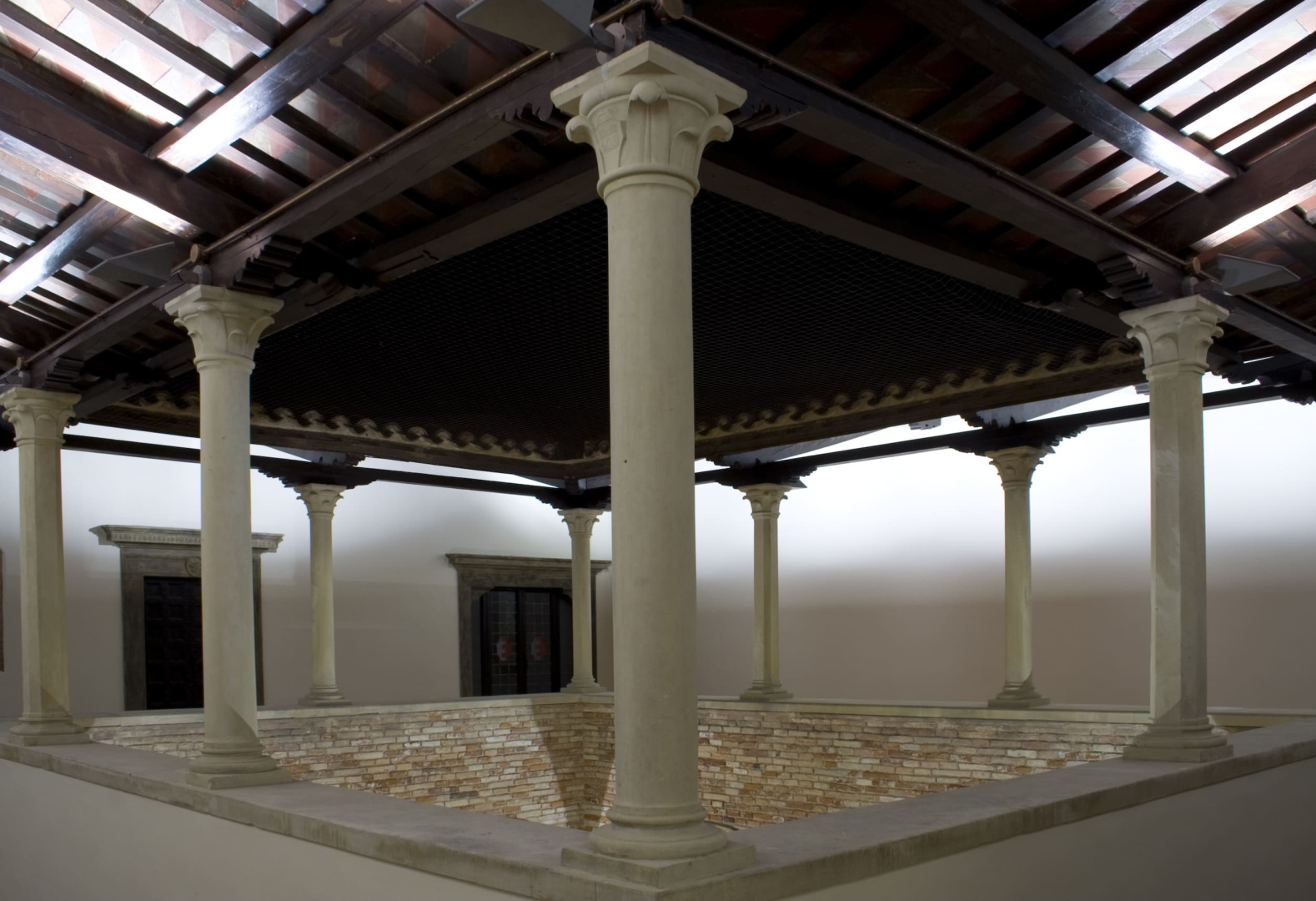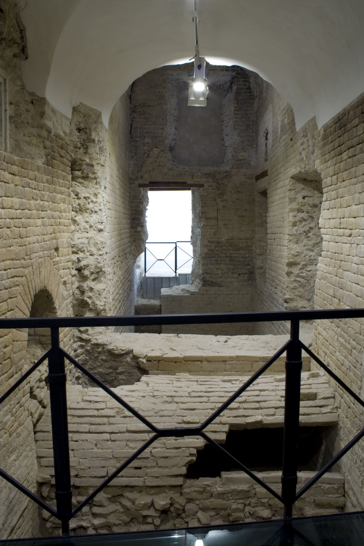 Il Complesso San Michele custodisce al suo interno testimonianze preziose della storia di Fano, inglobando tratti di muratura di epoca romana collegati all’antico Arco d’Augusto. Questi elementi storici sono visibili nell’ambiente interrato, caratterizzato da volte in muratura realizzate in epoche successive, e lungo la rampa che collega il piano terra, fino alle pareti del loggiato affacciato su via Arco d’Augusto, in continuità con la porta romana.