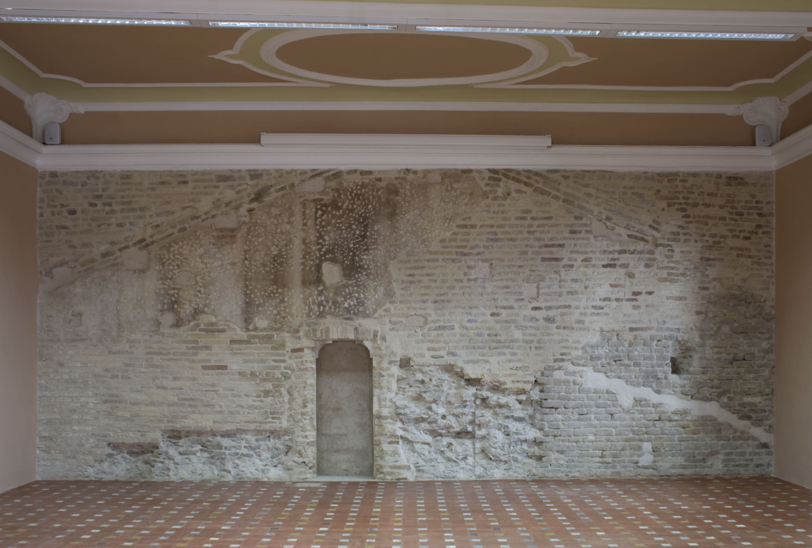 Le superfici originali sono state oggetto di un attento restauro conservativo, che ha previsto la rimozione delle parti non coerenti, la stuccatura delle lacune e un trattamento finale traspirante, nel rispetto del progetto originario.