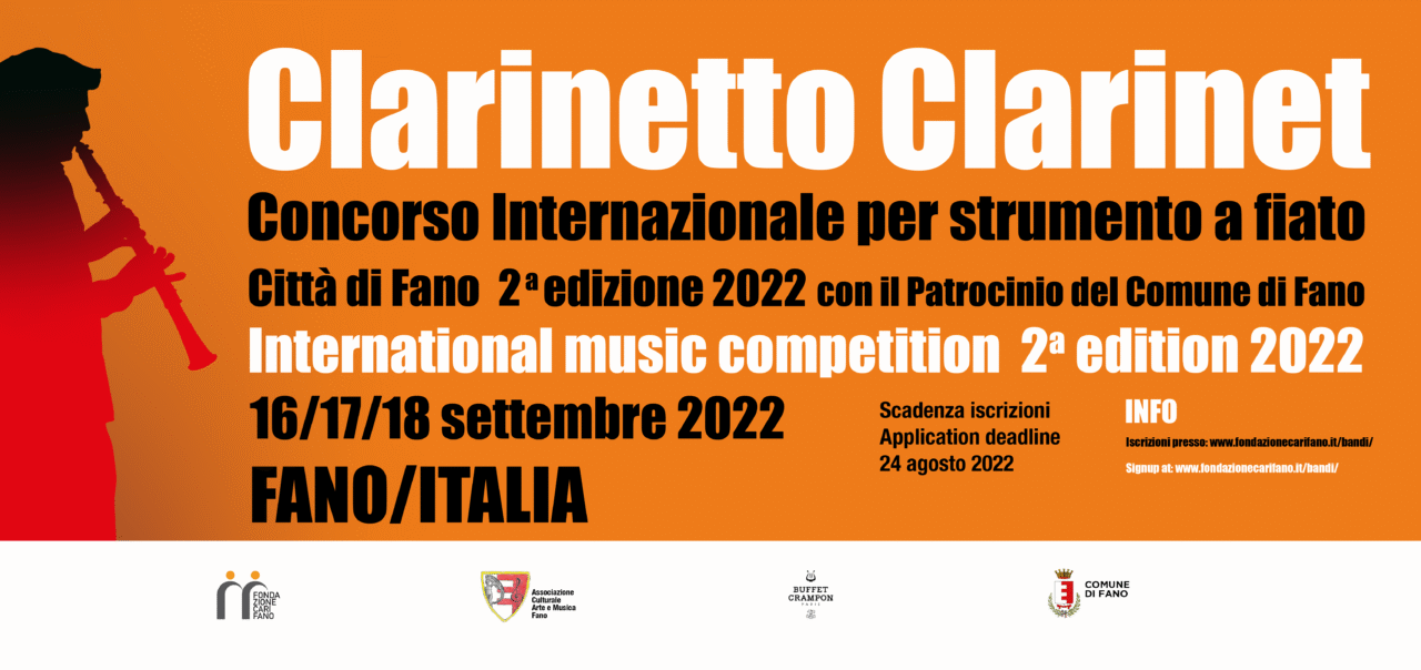 L’Associazione Arte e Musica di Fano in collaborazione con la Fondazione e con il patrocinio del Comune di Fano ha emesso in data 14/04/2022 il concorso per giovani clarinettisti (età fra i 15 e 35 anni).
