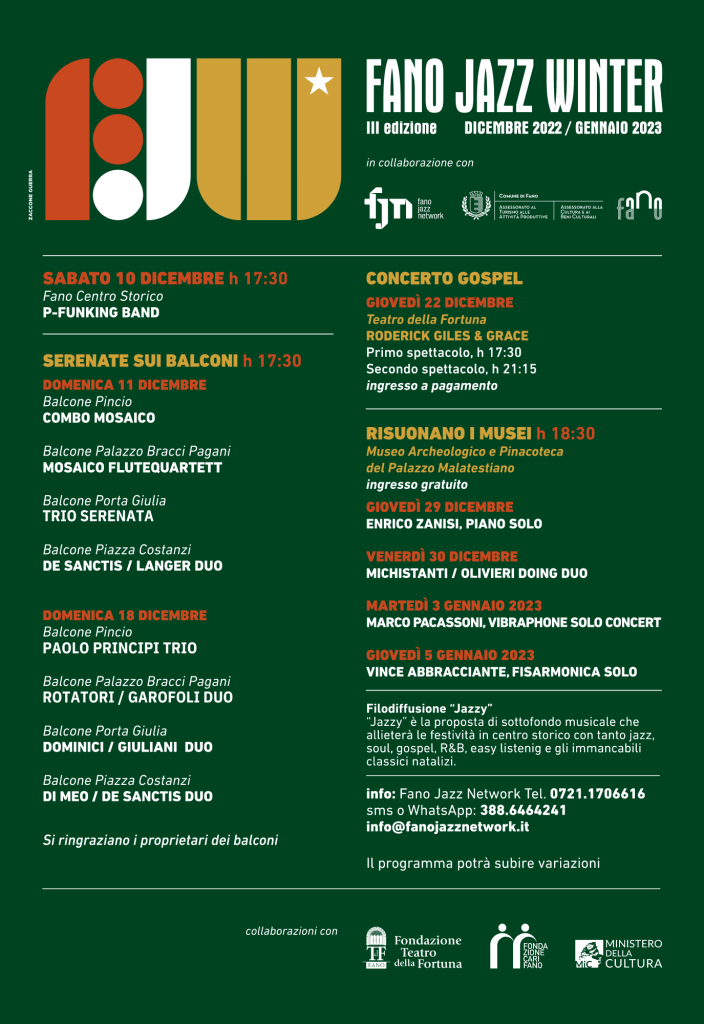 Dopo le riuscite esperienze delle precedenti edizioni del 2020 e 2021, torna Fano Jazz Winter 2022 che si preannuncia, ancora una volta, come occasione importante per coinvolgere la Città attorno a proposte artistiche di qualità.