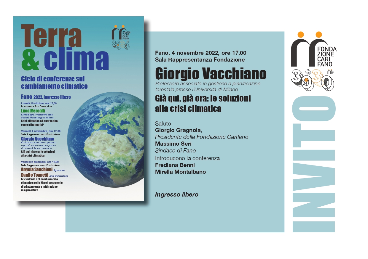 Per l’occasione interverrà Giorgio Vacchiano professore associato in gestione e pianificazione forestale presso l’Università di Milano. La conferenza sarà aperta da un saluto del Presidente della Fondazione Carifano Giorgio Gragnola e del Sindaco di Fano Massimo Seri, introdurranno la conferenza Frediana Benni e Mirella Montalbano.