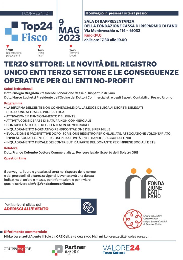 Avrà luogo il prossimo 9 maggio, dalle 17,30 alle 19,00 il convegno dal titolo “TERZO SETTORE: LE NOVITÀ DEL REGISTRO UNICO ENTI TERZO SETTORE E LE CONSEGUENZE OPERATIVE PER GLI ENTI NO-PROFIT”. L’evento è organizzato da Il Sole 24 ORE e dalla Fondazione Cassa di Risparmio di Fano, con la partecipazione dell’Ordine dei Commercialisti e degli Esperti Contabili di Pesaro Urbino e si terrà presso la Sala di Rappresentanza della Fondazione.
